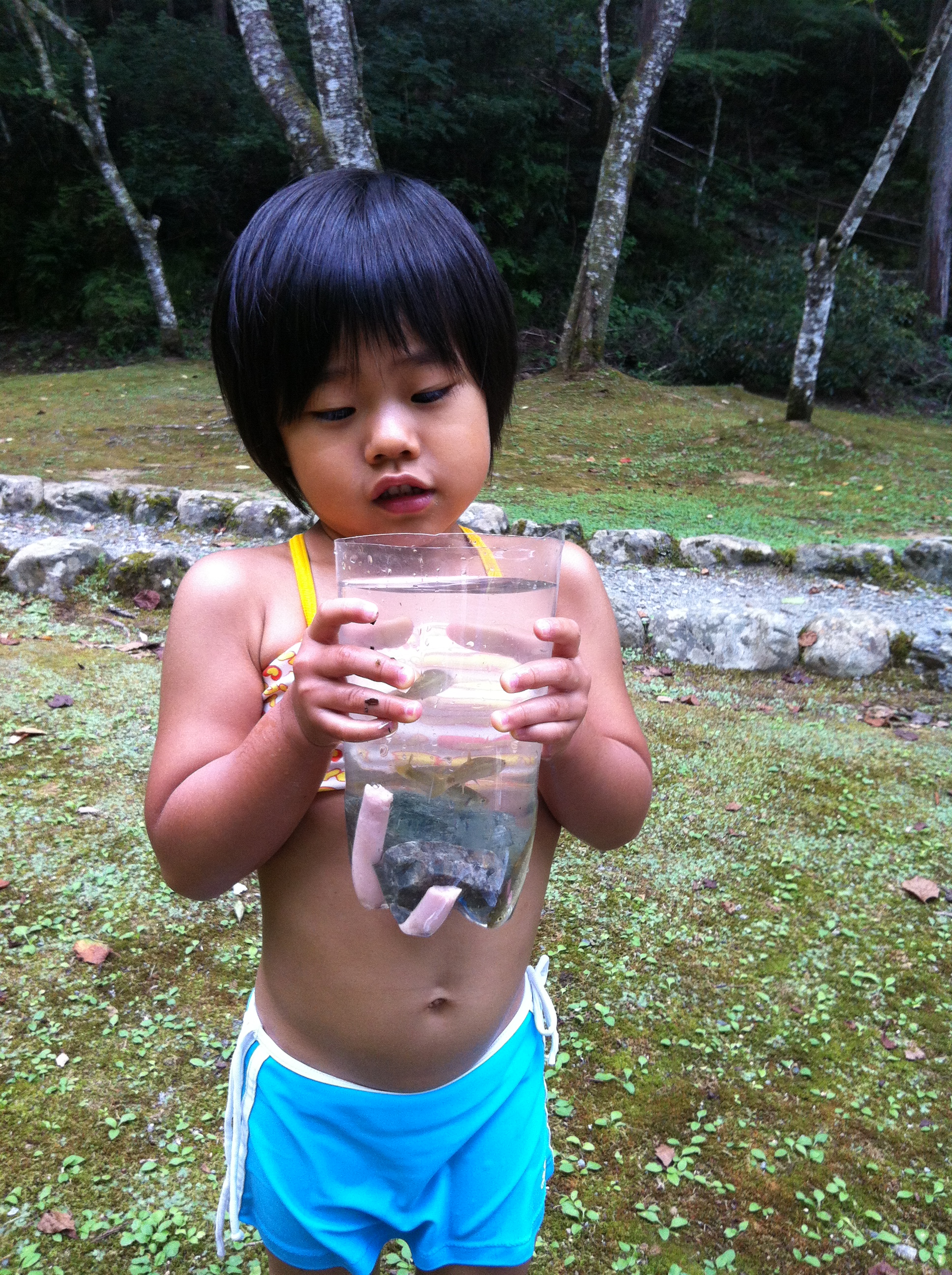 川の中には、小さな魚がいっぱいおり、嫁さんが即席で作ったペットボトル+ウインナーの仕掛けを置いてみました